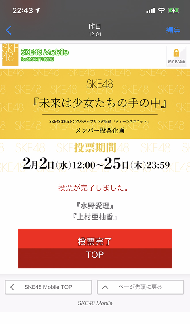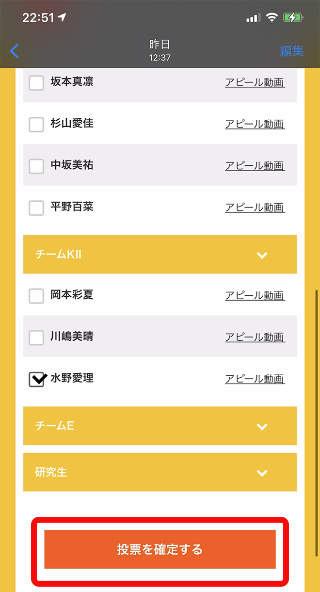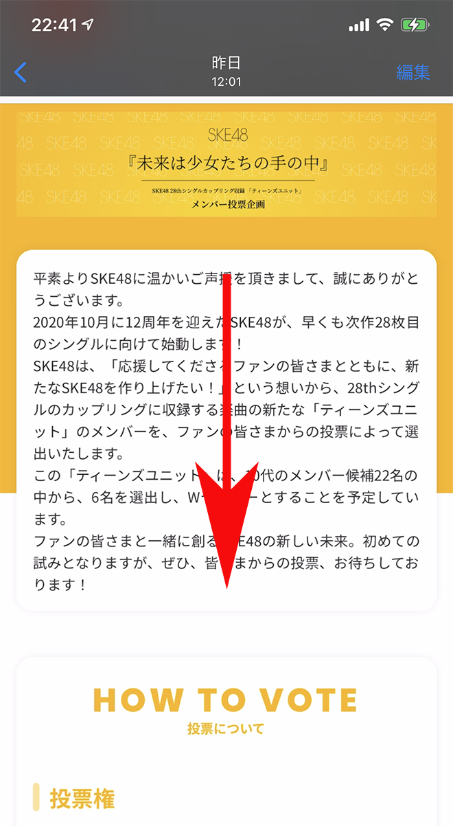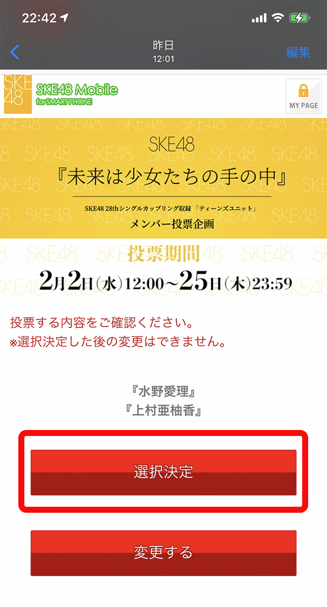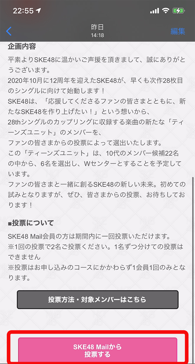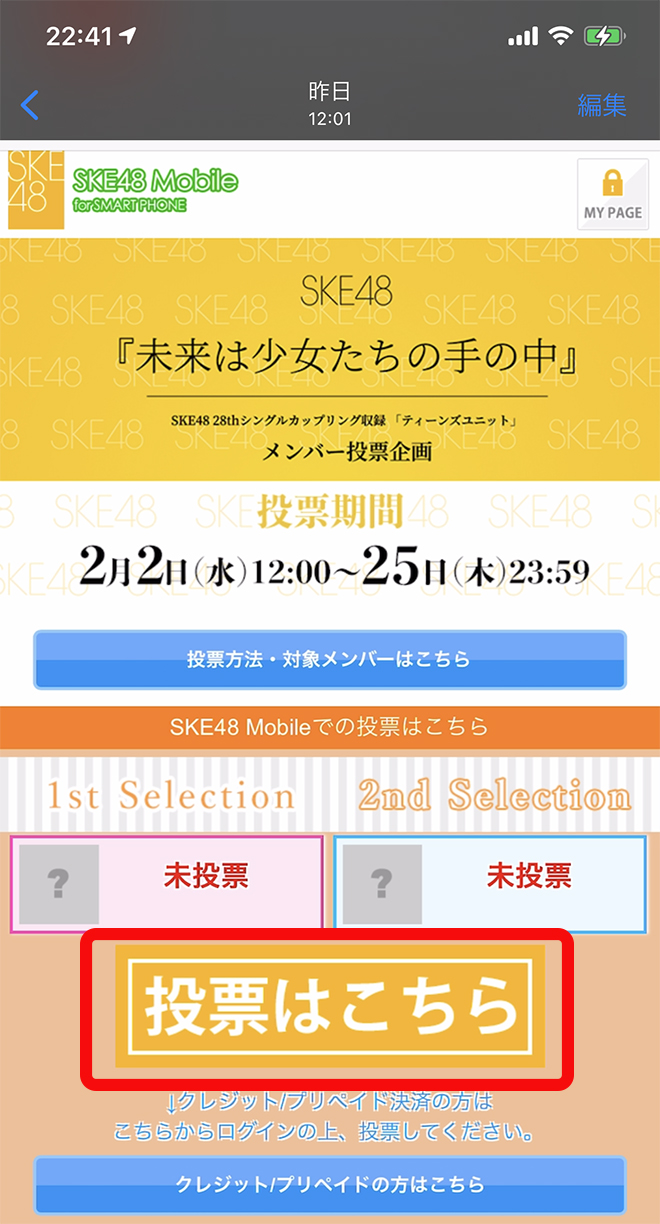 SKE48 familyを開き、「未来は少女たちの手の中」企画の投票をタップします
