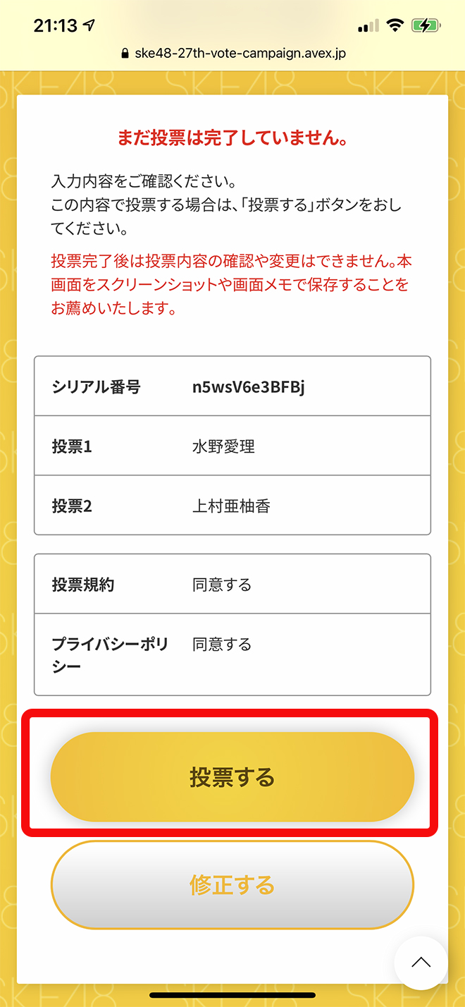 シリアルコードを入力し一人目に「水野愛理」ちゃん二人目はお好きなメンバーを選び確認ページへすすむをタップします