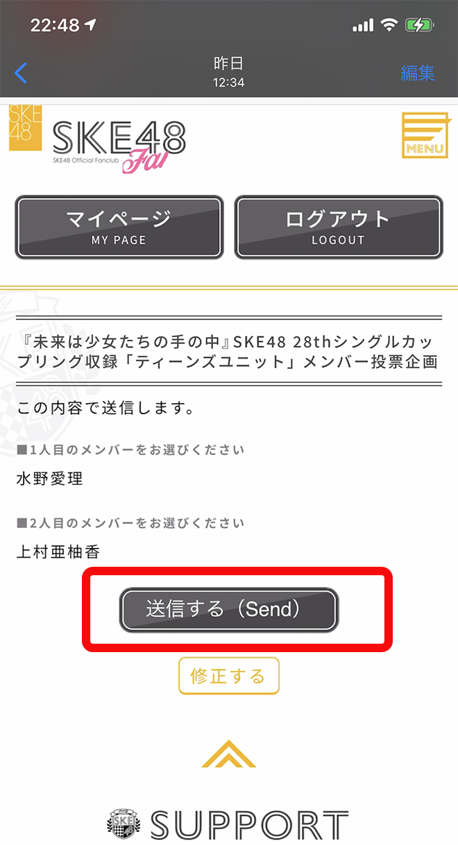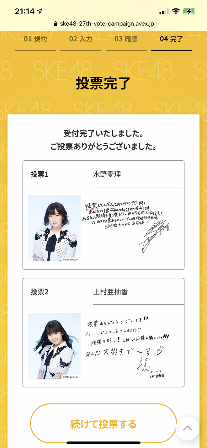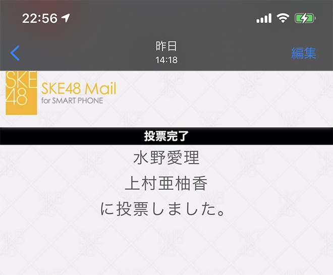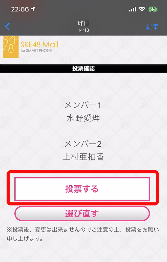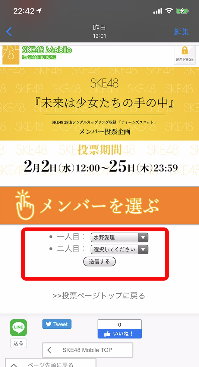 一人目に「水野愛理」ちゃん二人目はお好きなメンバーを選び送信します