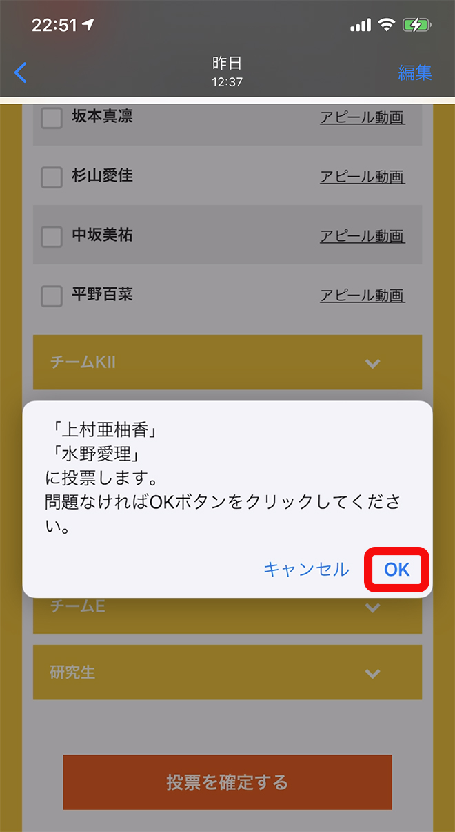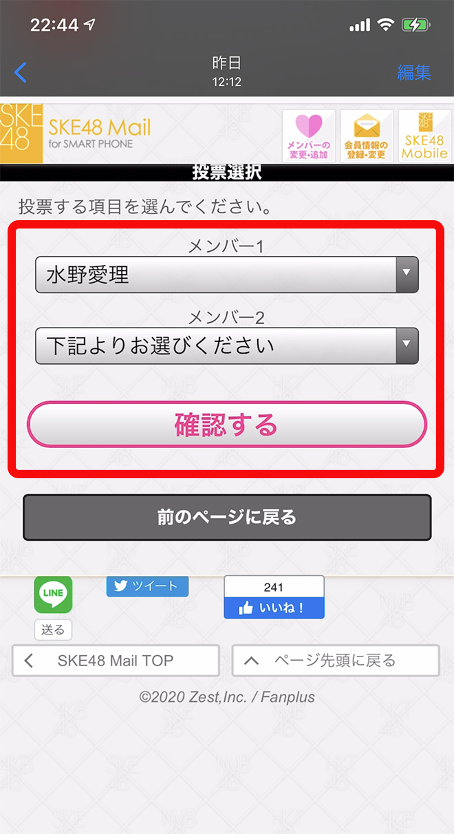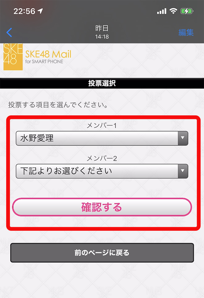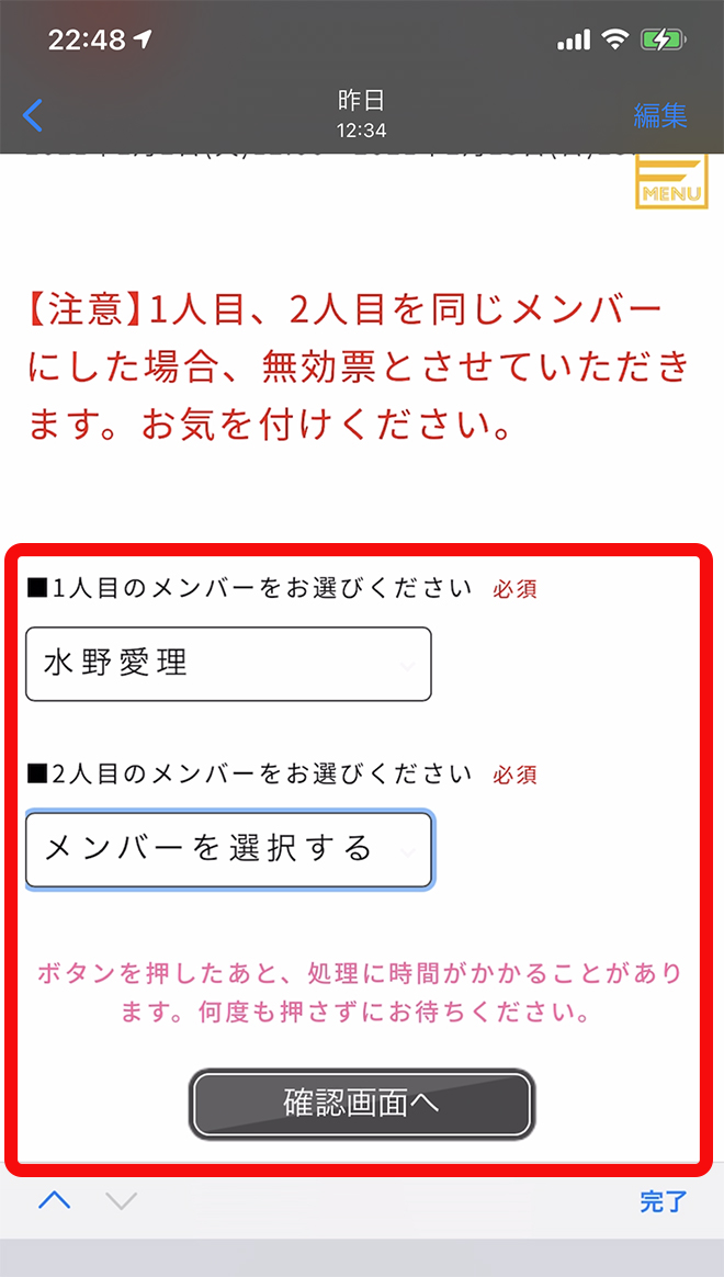 下にスクロールし一人目に「水野愛理」ちゃん二人目はお好きなメンバーを選び確認画面へを推します