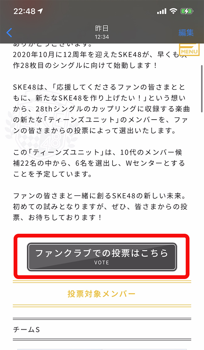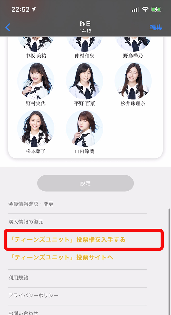 ティーンズユニット投票権を入手するをタップします(この欄が表示されない場合はアプリのアップデートを行ってください)